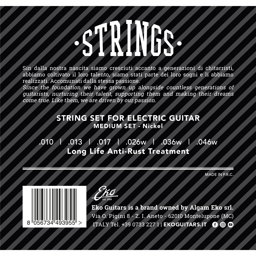 Σετ χορδών από νίκελ για ηλεκτρική κιθάρα από την Eko Guitars με κανονική τάση και κλιμάκωση 0,010-,046. Κατάλληλο για όλους τους τύπους ηλεκτρικής κιθάρας και ιδανικό για όλες τις τεχνικές παιξίματος, από τη συνοδεία μέχρι τα σόλο.